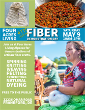 Stop by Four Acres Living Alpaca Farm and learn about all the ways to create with natural fibers. Visit and feed the alpacas, chat with our fiber artists and watch demonstrations of knitting, spinning, crochet, felting, weaving and dyeing with natural dyes. There's no entrance fee for this event!